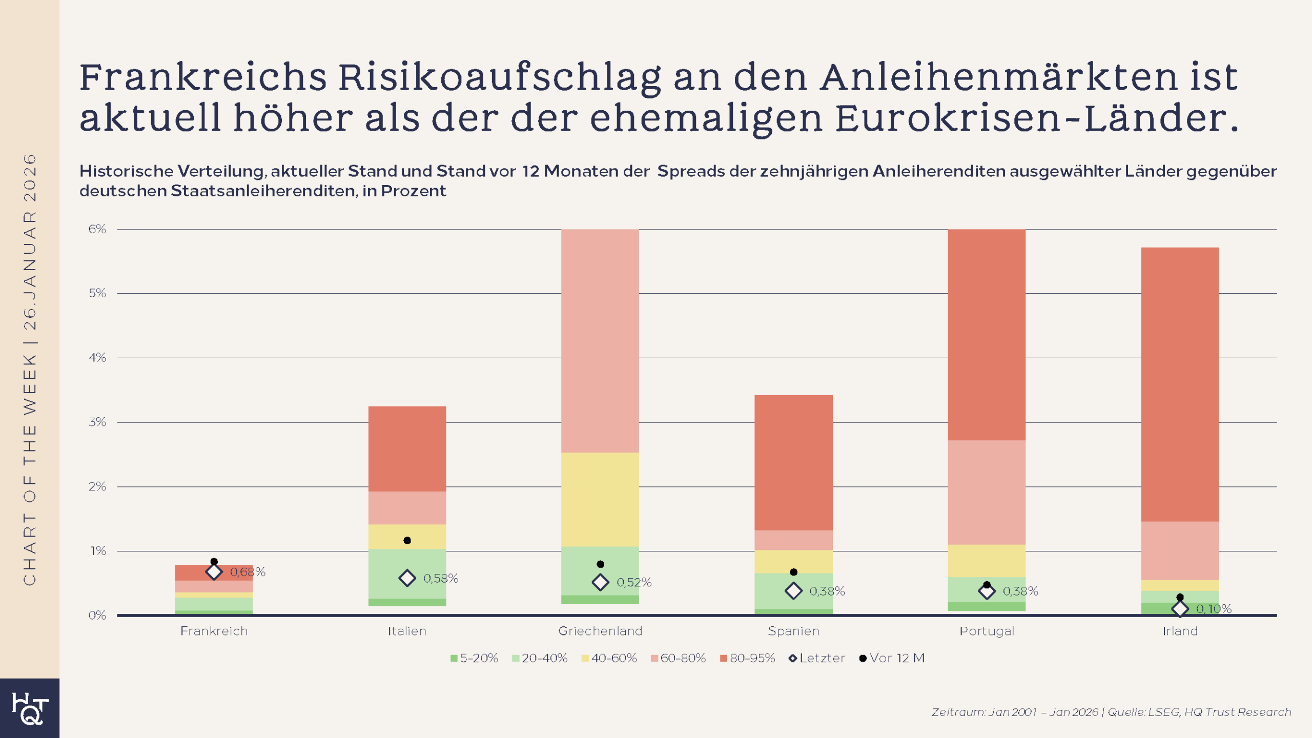 Der Chart zeigt nicht nur den aktuellen Stand sowie den Wert vor zwölf Monaten, sondern auch die historische Verteilung dieser Spreads. Damit lässt sich nachvollziehen, wie sich die Wahrnehmung von Risiko in Europa im Zeitverlauf verschoben hat – und wie stark sich die Lage in den klassischen Südländern verbessert hat. Die Darstellung der historischen Verteilung zeigt den Bereich zwischen dem 5. und 95. Perzentil, wodurch extreme Ausreißer an den Rändern ausgeblendet werden. Während der Eurokrise lagen die Spreads zeitweise oberhalb von 20 Prozent.