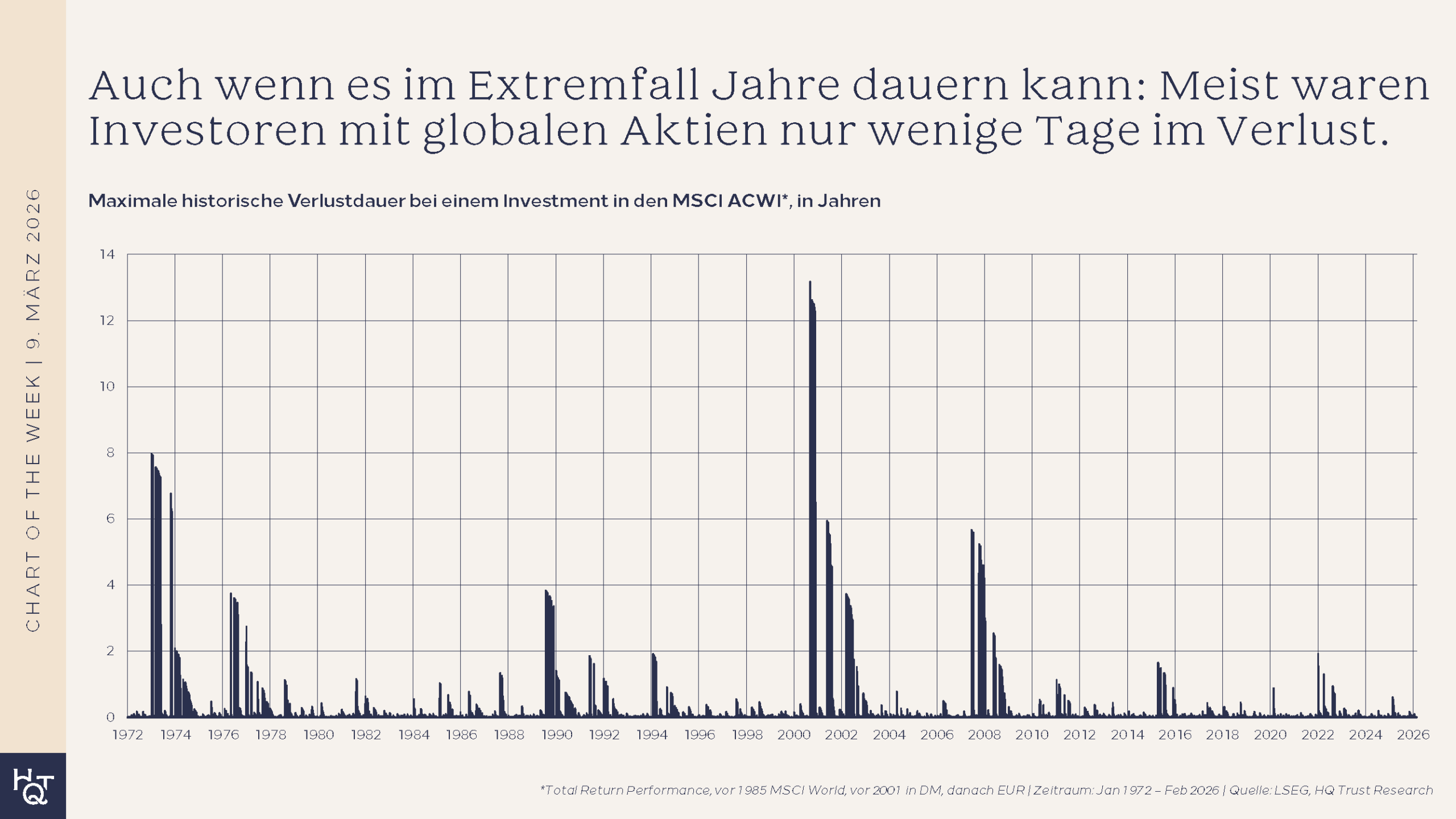 - „Doch die historische Evidenz zeigt: Wenn man global gestreut investiert, sind die meisten Verlustphasen überraschend kurz, selbst wenn die Nachrichtenlage dramatisch wirkt.“