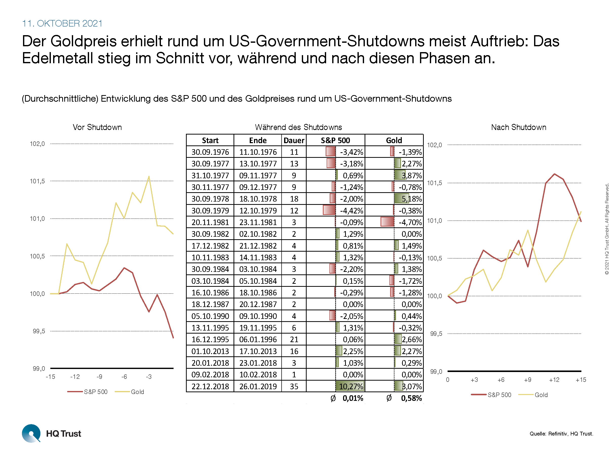 - „Der Goldpreis erhielt rund um US-Government-Shutdowns meist Auftrieb: Das Edelmetall stieg im Schnitt vor, während und nach diesen Phasen an.“
