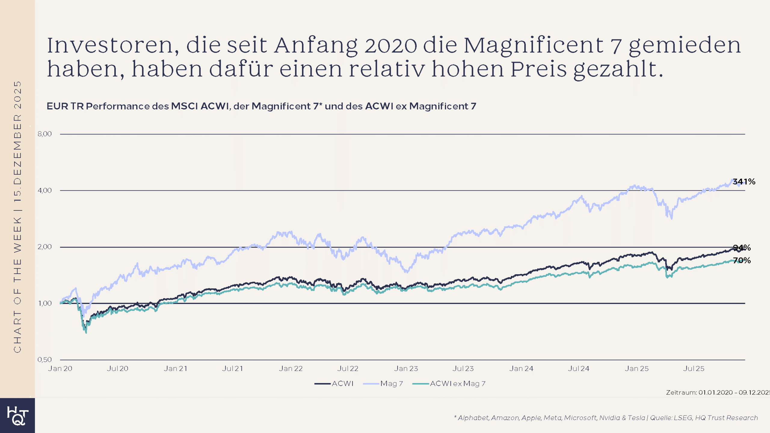 - „Wer aus Sorge vor Konzentration oder aus regionalen Präferenzen – etwa dem Anfang 2025 populären Europa-Optimismus – die Magnificent 7 gemieden hat, hat dafür einen relativ hohen Preis gezahlt.“